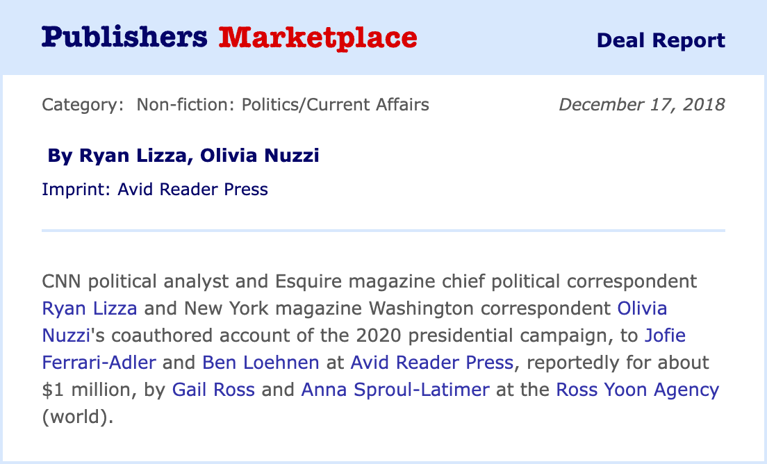 In 2018, she sold a book about the 2020 presidential campaign “reportedly for about $1 million.” This book was supposed to be coauthored with Ryan Lizza, another political correspondent (and her then-fiancé).